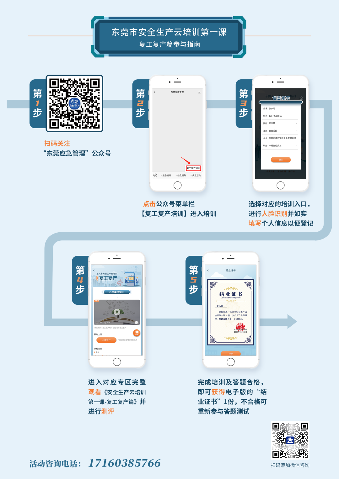 參與指南:關(guān)注“東莞應(yīng)急管理”公眾號,通過點(diǎn)擊公眾號菜單欄【線上活動(dòng)→復(fù)工復(fù)產(chǎn)培訓(xùn)】,登記個(gè)人信息,完成注冊后,點(diǎn)擊“我要參加”進(jìn)入培訓(xùn)內(nèi)容界面,點(diǎn)擊觀看視頻進(jìn)行學(xué)習(xí)。